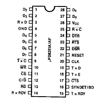 The D8251AFC is a programmable communications interface. The D8251AFC is designed for microcomputer systems data communications. The USART is used as a peripheral and is programmed by the D8251AFC or other processor to communicate in commonly used serial data transmission techniques including IBM Bi-sync. The USART receives serial data streams and convert s them into paralled data characters for the processor.